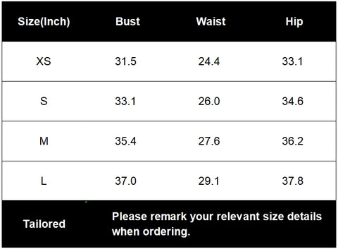* Please kindly provide your shoulder, bust, underbust, waist and mid hip measurements(inch/cm) when placing the order if you pick tailored size, to ensure a better fit and comfort in your clothing.